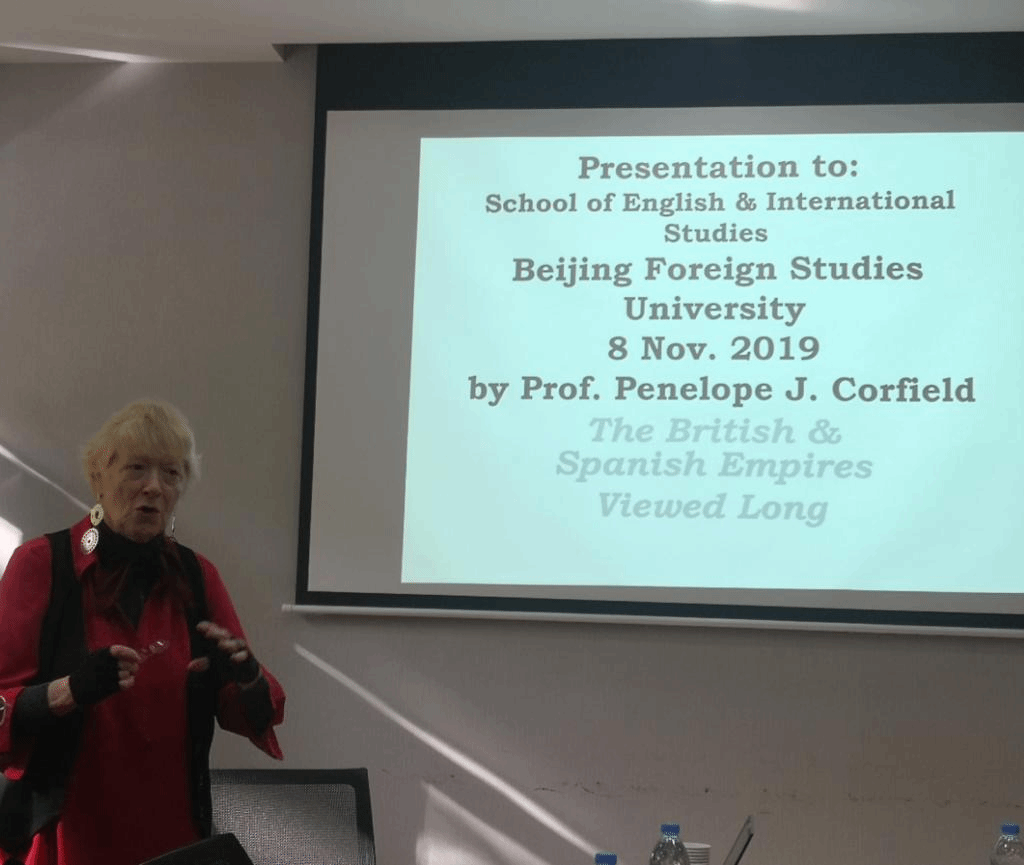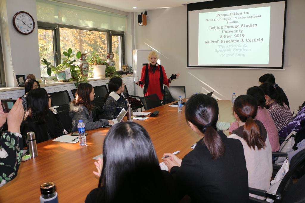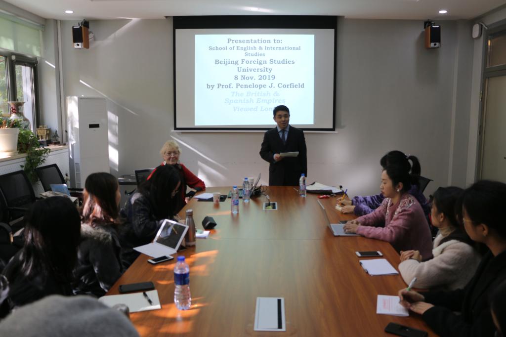 2019年11月8日上午,英国18世纪研究会主席、国际18世纪研究会副主席、伦敦大学皇家霍洛威学院教授Penelope Corfield女士访问太阳集团tyc9728英国研究中心、爱尔兰研究中心并以 “西班牙帝国和大英帝国兴衰的长时段历史考察”为题面向太阳集团tyc9728师生做了学术讲座。太阳集团tyc9728副院长、英国研究中心、爱尔兰研究中心主任王展鹏主持讲座并就有关合作进行了讨论。