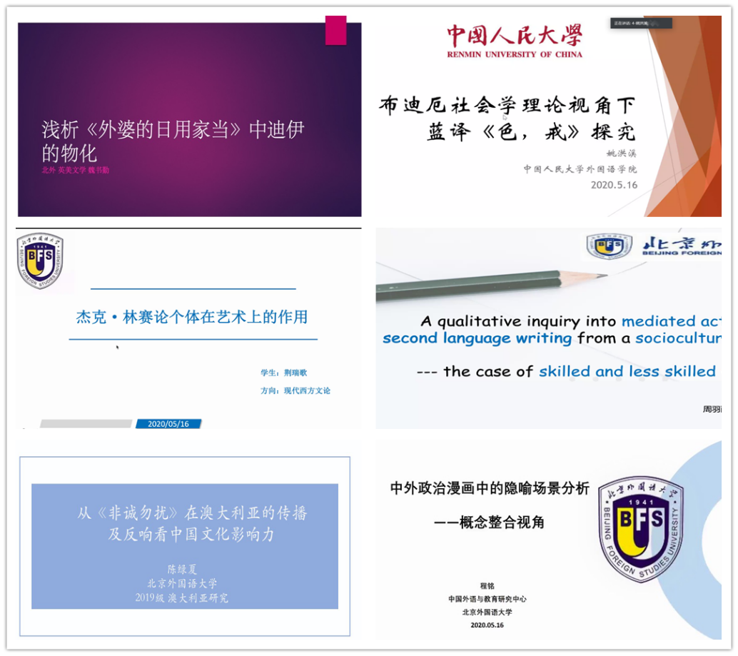 北京外国语大学魏书勤对著名黑人小说作品《外婆的日用家当》中女主人公迪伊的物化进行了剖析;北京外国语大学荆瑞歌结合研究阐释了艺术家的个体具有独特的艺术作用这一论题;北京外国语大学陈绿夏探究了《非诚勿扰》在澳大利亚的传播情况及反响;中国人民大学姚洪溪从布迪厄社会学理论研究蓝译《色戒》出版、传播与接受情况;北京外国语大学周羽西探究了以汉语为母语的高水平和低水平英语学习者在策略运用上的差异;北京外国语大学程铭分析中外政治漫画中的隐喻场景,指明中外媒体漫画呈现出不同的中国形象。