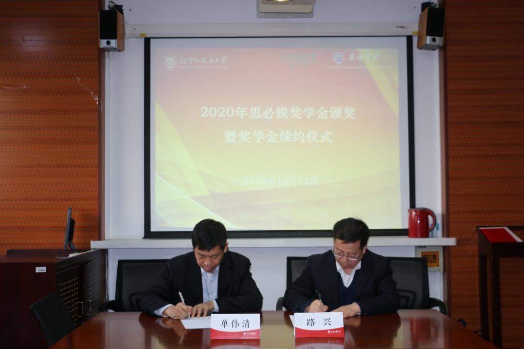 12月11日上午,太阳集团tyc9728举行2020年思必锐奖学金颁奖暨奖学金续约仪式。北京思必锐翻译有限公司总经理单伟清,国际合作部经理秦肖斌,资源部负责人王艺璐一行前来太阳集团tyc9728与师生座谈。党总支书记路兴,党总支副书记孟庆琨,辅导员于承杰以及2020年思必锐奖学金获奖学生参会。