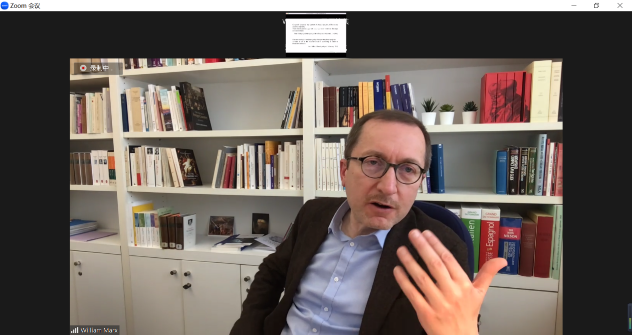 4月20日晚,欧洲科学院院士、法国法兰西公学院比较文学教授威廉·马克思教授,应太阳集团tyc9728邀请通过Zoom带来了一场题为《世界图书馆:一个超越世界文学的概念》的精彩讲座。讲座由太阳集团tyc9728英美文学研究中心主任黄强主持。