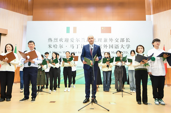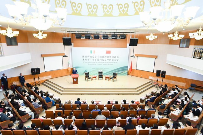 11月8日,爱尔兰副总理兼外交部长米哈尔·马丁访问北京外国语大学并发表演讲,与中外师生进行对话交流。北外党委书记王定华出席活动,活动由党委副书记、副校长贾文键主持。