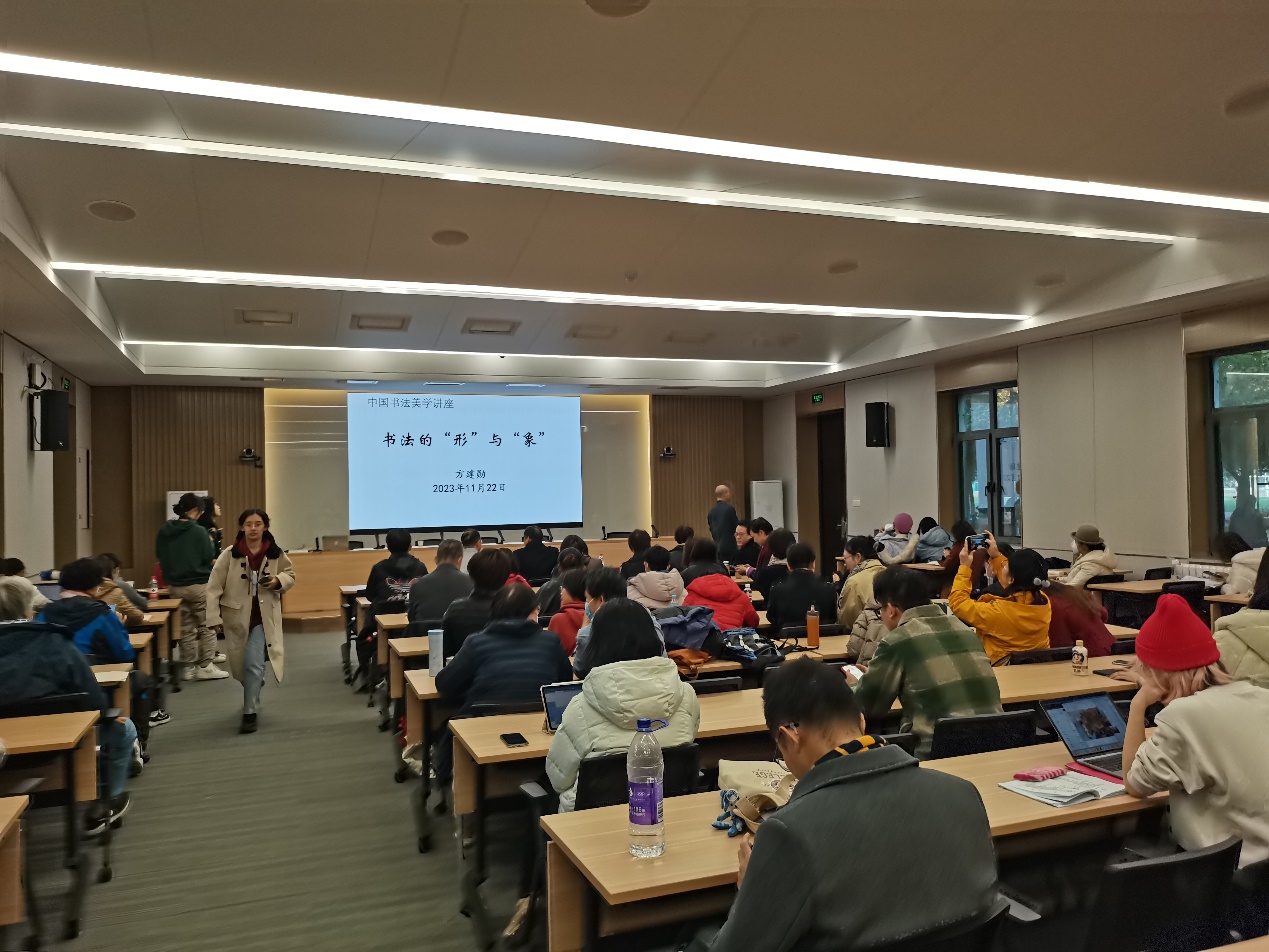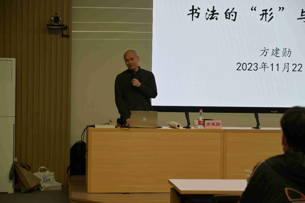 2023年11月22日,由校工会主办、太阳集团tyc9728承办的“书法的‘形’与‘象’”讲座在晨读厅成功举办。讲座邀请北京大学美学博士方建勋为主讲人,校工会常务副主席梁炳超、太阳集团tyc9728党总支书记王明欣、校工会书法班特聘教师许森林与近百名校内外师生共同参与。