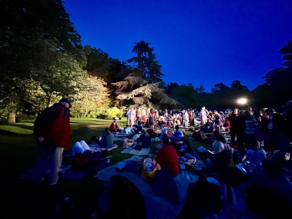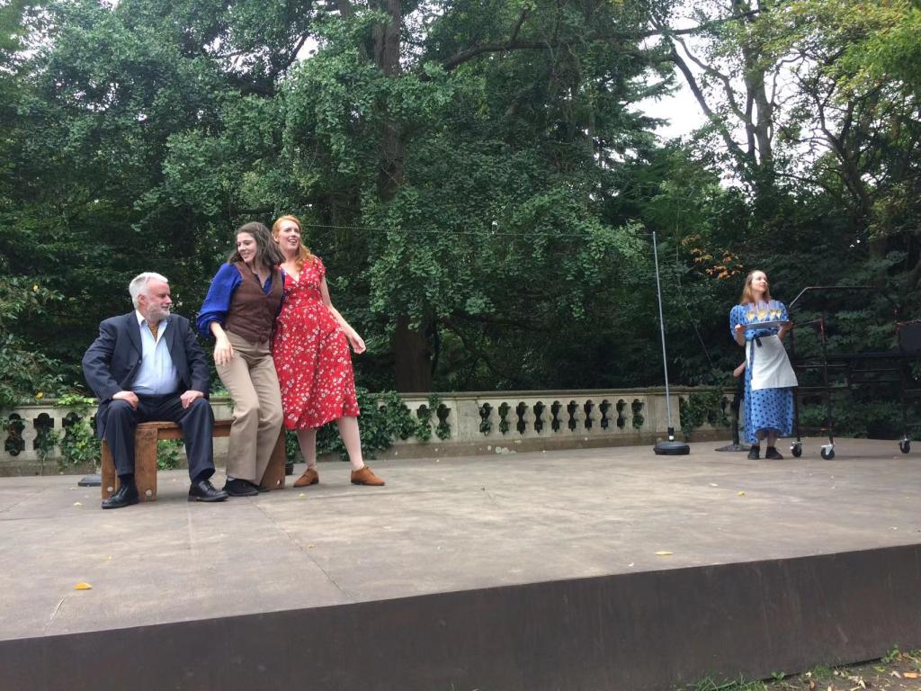 当日下午,实践团成员在斯特拉特福镇的戴尔(原文Dell亦有山谷之意)露天剧院观看了由诺丁汉剧团演出的《无事生非》,剧中的公爵佩德罗是由一位坐轮椅的女演员反串出演,对实践团中不熟悉伊丽莎白时期英国演剧传统的同学而言是一次耳目一新的感受,因实践团8月25日晚在剑桥岔道口演剧厅上演的莎士比亚喜剧《第十二夜》也将使用反串技法,如剧中的公爵奥西诺同样是由女同学饰演,诺丁汉剧团的演出让大家既能从莎剧中的人物角色窥见文艺复兴时期英国的文学与文化传统,也启发实践团成员从新视角来反思父权社会的性别角色问题,并能借鉴专业演员诠释人物的方式来丰富自身塑造的角色。