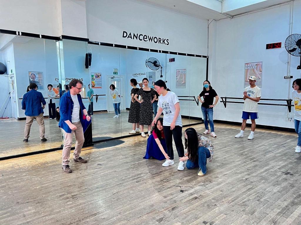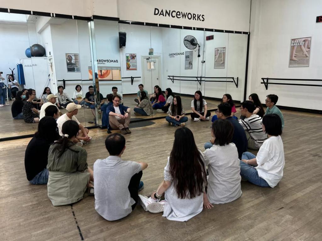 当日下午实践团成员参加了在伦敦西区舞蹈艺术工作坊举办的戏剧工作坊,指导教师Michael以莎士比亚后期传奇剧《暴风雨》为例,向大家介绍了上演此剧时较难把握的方面,例如,如何呈现剧中的海岛环境,如何突显剧中的精灵艾利尔与女巫辛考拉克斯之子卡利班的区别、如何在演出中充分表现原剧中的超自然元素。实践团成员在工作室指导教师的辅导下,进行与模拟情境相关的声音和肢体动作训练。
