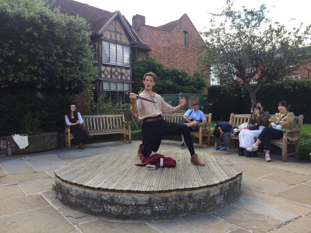 实践团成员还在莎士比亚故居花园观赏了专业演员上演的莎士比亚浪漫喜剧《仲夏夜之梦》和爱情喜剧《无事生非》的片段,演员们对仙后在“爱懒花”花汁影响下爱上驴头人身的雅典织工波顿、贵族青年男女本尼狄克与比特丽阿斯遭受的情感考验做了活泼生动的闹剧化处理,用丰富的面部表情和肢体语言增加了莎士比亚戏剧语言的魅力。演员们用花冠、灯盏等简单道具改换人物身份和表达人物内心感受的方式给实践团成员留下了深刻的印象。