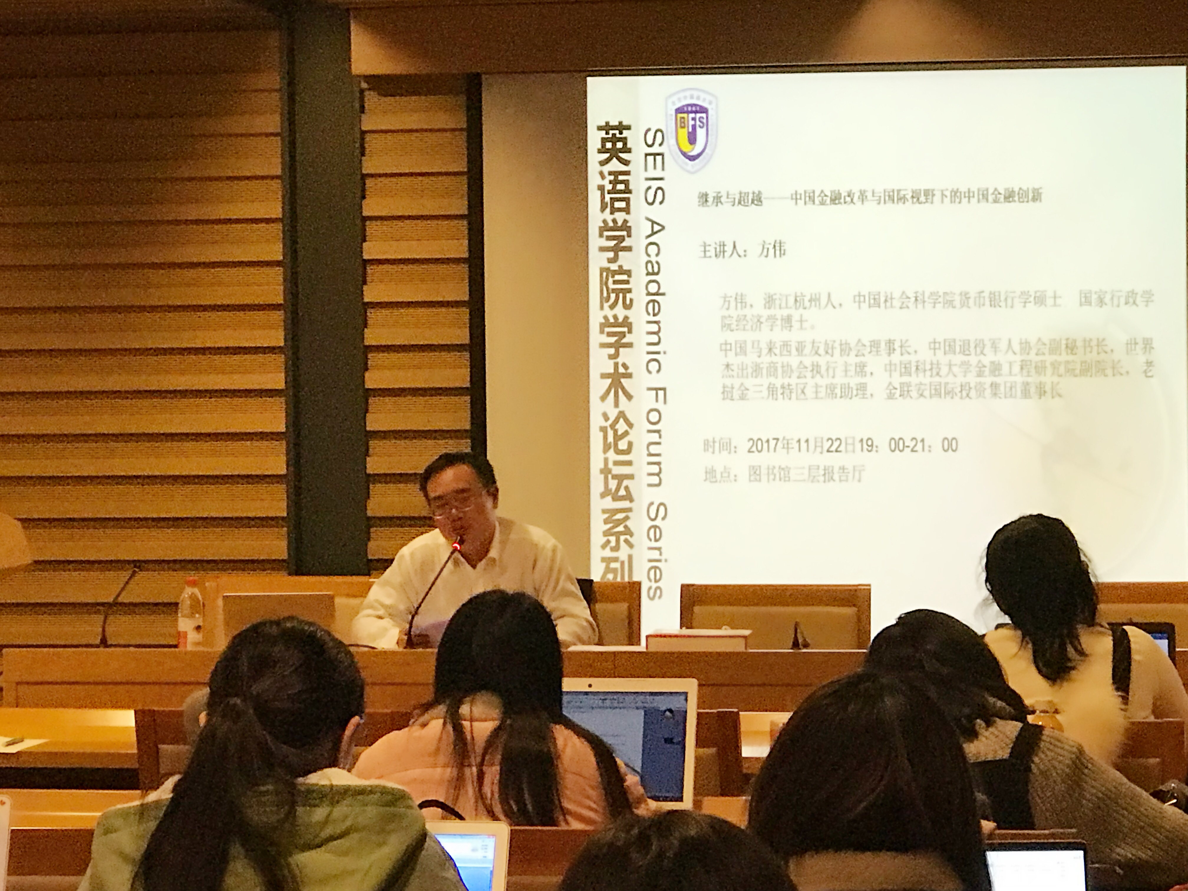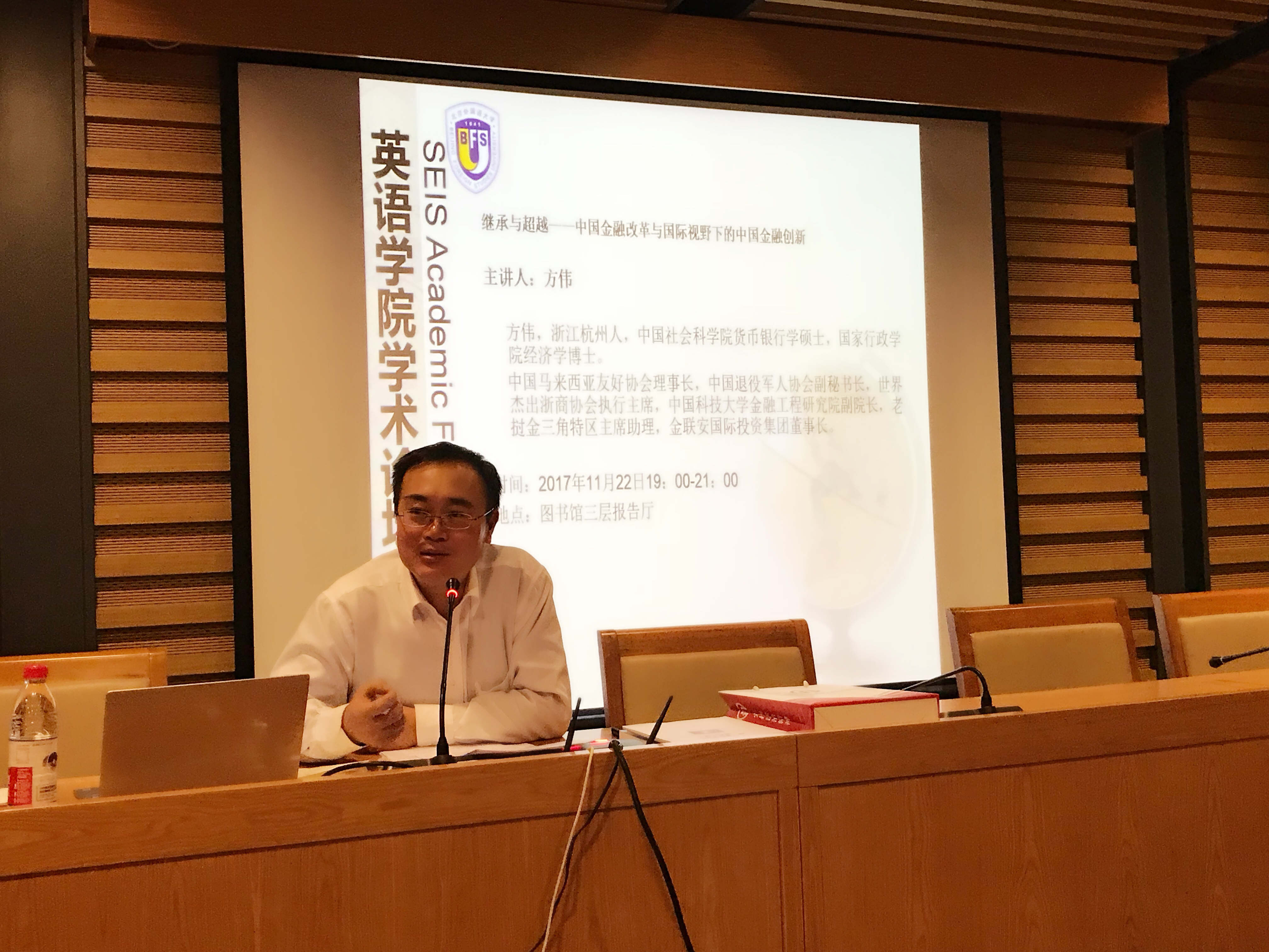 ——2017年11月22日晚7点,图书馆三楼学术报告厅,世界杰出浙商协会执行主席、金联安国际投资集团董事长、国家行政学院经济学博士方伟老师为北外师生作讲座,题为“继承与超越——中国金融改革与国际视野下的中国金融创新”,讲座由董宜坤博士主持。讲座后,英学职针对同学们在学业与职业选择规划上的困惑、尤其是众多日后有志从事金融行业相关工作的疑问,对方伟博士进行了专访。