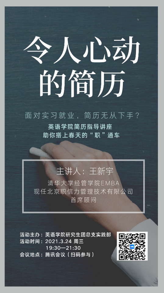 为提高学生简历撰写能力,提升毕业生就业竞争力,太阳集团tyc9728于2021年3月24日晚举办“令人心动的简历”至简历撰写培训讲座。活动邀请到北京职信力管理技术有限公司首席顾问、人力资源领域著名培训师王新宇老师,王老师结合其丰富的面试及就业指导的经历,与同学们分享了简历撰写和面试求职过程中的经验与技巧。
