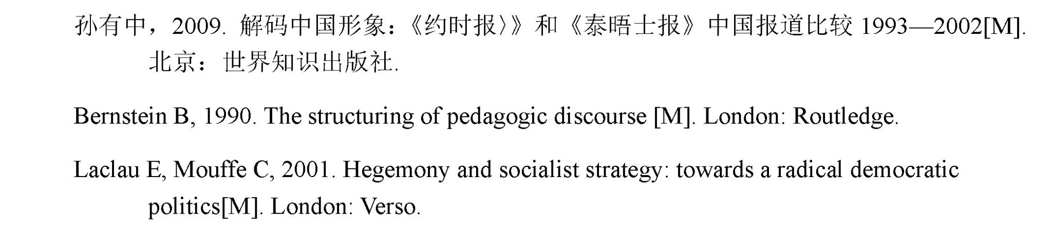专著书写顺序为:作者或编者的姓名、出版年份、书名(不标书名号)、标识码、出版社所在城市、出版社;多名作者之间用逗号隔开;外国作者时,姓+名(缩写,但不用缩略点)。具体示例: